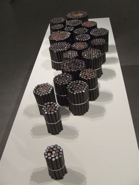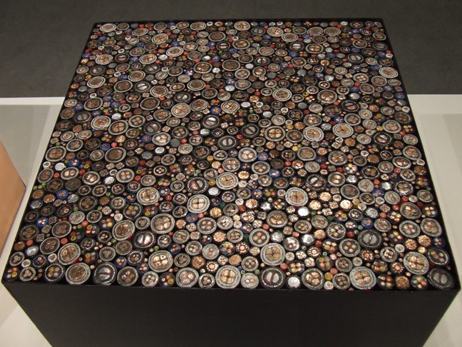 The work airtime plays around with the bundled copper cables tied together with a string of aluminium into what is akin to flower bouquets. Viewed from the top the bouquets, if we allow ourselves the latitude to address them as such, echo the middle cube of the work Cu3 in terms of the colour scheme that the cut through process of handling the copper cable has reveal when we view the work from above. The composition also is arranged in a conical shape procession from the first bundle to the throng of copper cables as the eye is led within the installation.