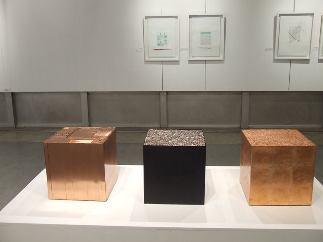 In Cu3 three cubes represent copper in different formations. In a granulated state, in a bundle state and in what the artist has termed ‘it’s mapping’ state. This installation is complemented by a couple of artworks on the adjacent wall that are two dimensional renditions of copper in its mapped state and bundled state.