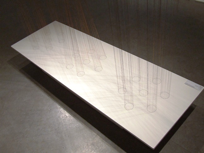 The 3 Core installation is a deconstruction of the composition of a copper cable. The artist here has taken copper apart to reveal its hexagonical (six sided) construction with a centre in the middle. This gives the viewer a sort of a magnified look into how a copper cable is constructed with regard to the cable in the centre which actually is the same as the one we use in our houses. The straight lines of the two deconstructed copper cable, running from ceiling to the floor, in needle size threads – frames the middle cable on either sides rhythmically through the hexagonical composition of the copper cable as the viewer moves around the artwork.