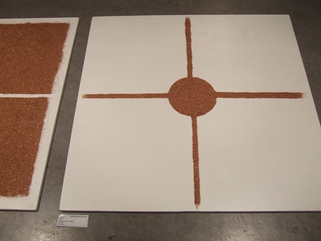 While the panel on the left side consists of four squares of granulated copper whose almost touching outlines in the mid-plane of the panel mimic lines that cross, the right hand panel’s granulated copper composed into lines cross each other into a circular shape. The panel on the right hand side represent a connection while the one on the left side represent a disconnect. The contrast here is between the smooth lines accentuated by the clever use of the white surface of the left hand side panel and rough lines of granulated copper on the right hand side. the left panel’s composition of white lines amidst four squares denotes disconnection wherein there is no ‘reach’ whereas with granulated copper lines a connection is established.