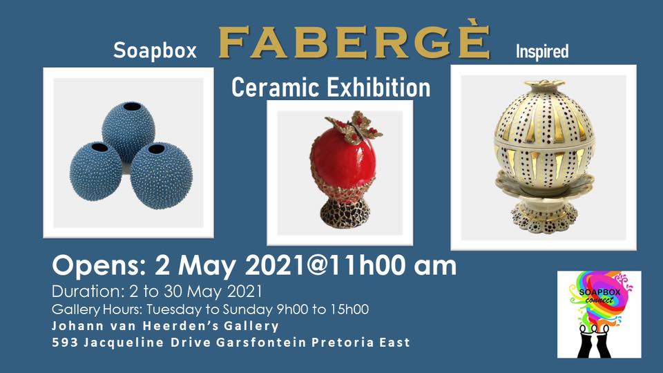 Johann van Heerdenโs Art and Gallery in Garsfomtein unveils FABERGร Exhibition on Sunday 02 May 2021. This exhibition will run until May 31. More than 80 ceramic artworks, inspired by the House of Fabergรฉ, will be on show. For more details you can reach out to the gallery: