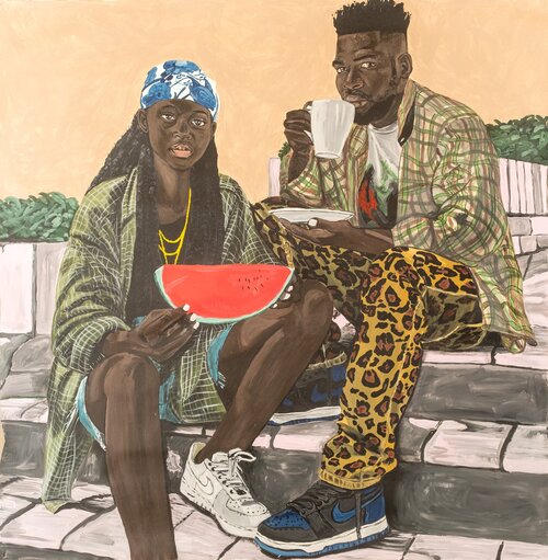 In several of the works, wonderfully bright, oversized eyeglasses emphasize the act of seeing and the impact of being seen. โI believe that art can make you look at someone differently,โ he told writer Enuยญma Okoro, โand Iโve always wondered, if we ignore other people, and fail to see them, can we still truly see ourselves?โ Taking a cue from the openness of his subjects, Makamo works intuitively, without blueprint, foregrounding expression and experimentation in his practice. At Makasiini, Makamo will preยญsent his first exhibition comprising entirely of portraits. All but one were completed in 2021, since the pandemic, carrying with them a new appreciation for the intimacy and distance that together make up our conception of one another. Nelson Makamo, lives and works in Johannesburg, South Africa.