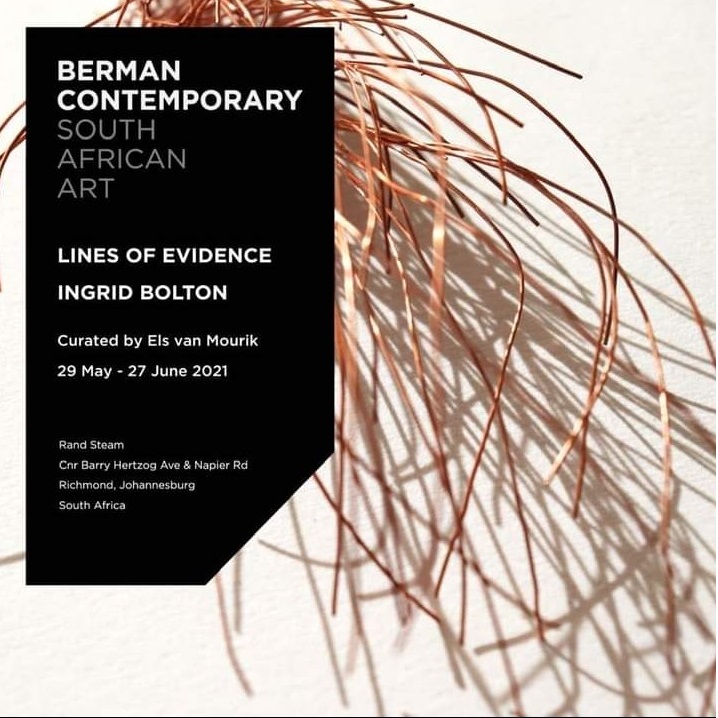 Ingrid Boltonโs new exhibition Lines of Evidence on at Berman Contemporary sees her combine materials she has used previously in her work such as Copper, Magnetite, Coal, Calcium Carbonate and Porcelain wherein she engaged with the discourse of pollution and natural resource sustainability, as was evidence in her solo exhibition held at the Pretoria Art Museum in 2013, following her scooping of the first prize in SASOL New Signatures Art Competition 2012.