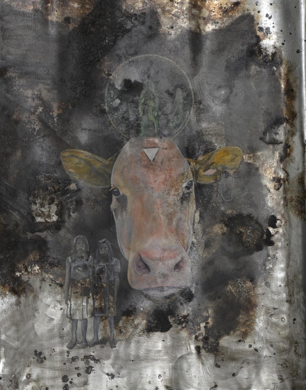 Figure 5. Sello Letswalo. Mma Kgomo le Pula (The Mother of the cow and the rain) 2021. Mixed Media on steel. This work was purchased during the show.
