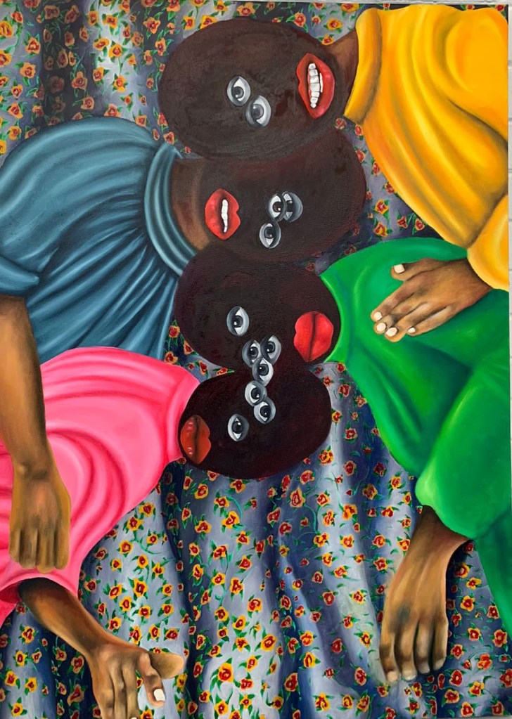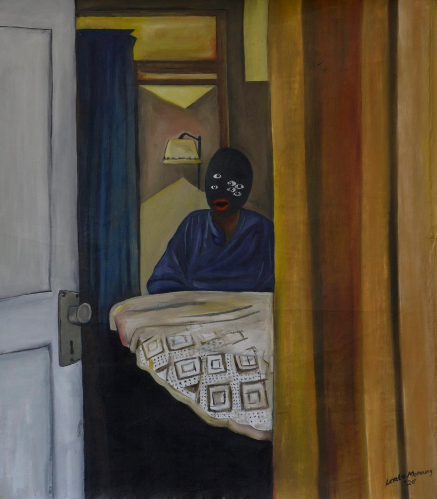 The reader is invited to compare Victim of Wicked Overseer (2021) with Motaung’s other two paintings, The Emergence of Sons of Men (2021) and Inside Oneself (2020). The artist’s icon, multiple eyes and drapery witnessed here in the curtain behind The Emergence of Sons of Men and the table cloth on Inside Oneself connects the artworks to Motaung’s artistic output iconically. However, Inside Oneself stand aside from the two pieces discussed here in its style of execution and setting. There is a feeling of solidity to its formal language.