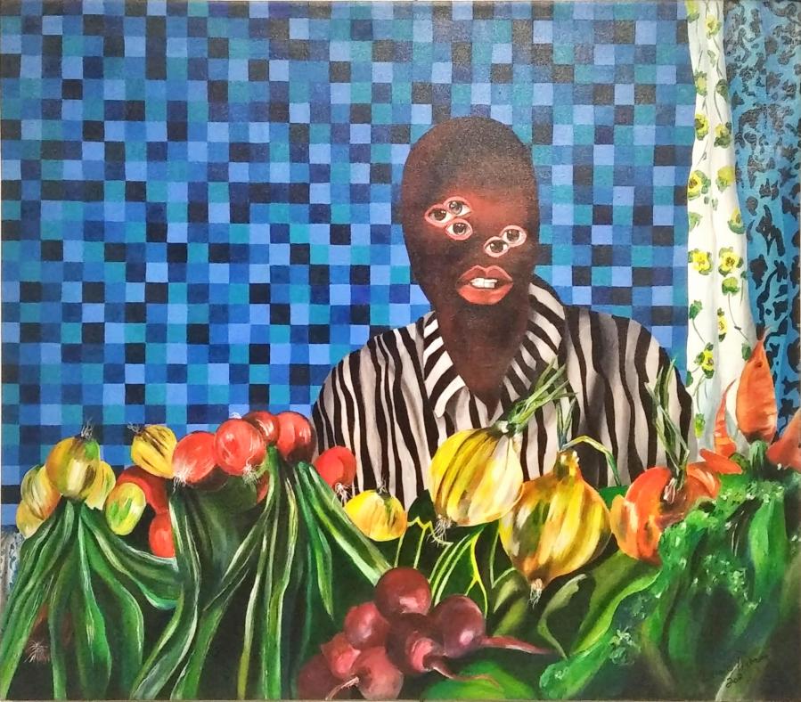Lerato Motaung’s Victim of Wicked Overseer’s picture plane can be broken into four parts[1]. These are the pixelated background, the figure, the floral curtain and the vegetables. The anomaly in the facial features of the figure heightens the tension in the work. Instead of having a normal person staring out of the picture plane at the viewer, we are met by a figure with missing ears and nose. With six eyes and an oversized mouth the figure peer at us. This deformity contributes to the strangeness of the subject matter. Notice how what is arranged in front of the figure appears to be mostly tubers and roots vegetables. in as far as our viewing of the work has progressed, we may be in concord that the composition is a representation of a street vendor. Anyone who is familiar with vegetable street vendors may expect to see a variety of vegetables when browsing through their trading goods. In this composition we don’t see other vegetables such as potatoes, tomatoes and butternuts. As such the tubers and roots carry on with violation of expectation that the artist first introduced with the figure’s facial features.