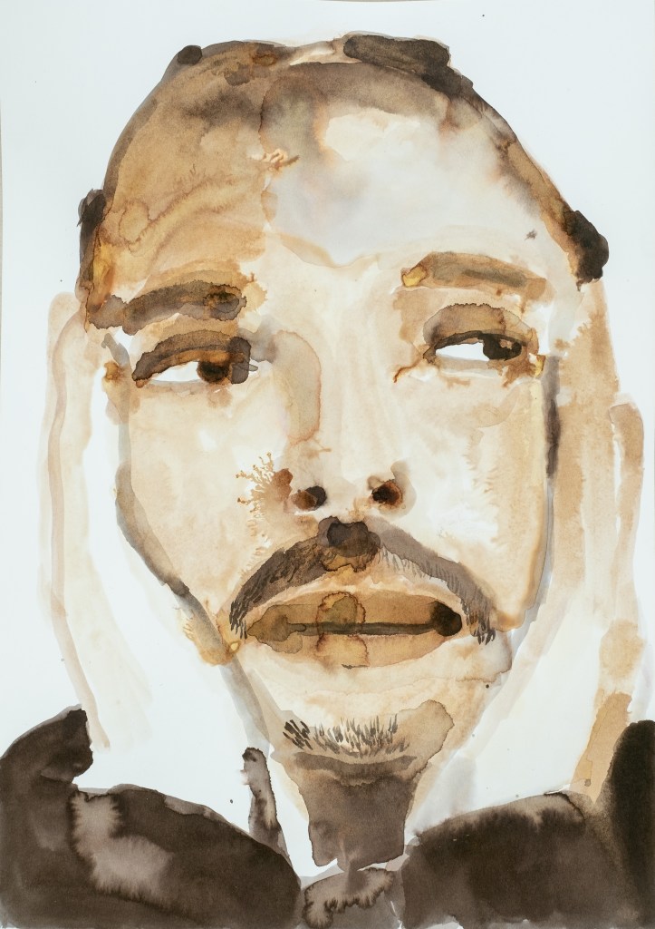 On the adjacent wall are the four portraits David (2022), Abloh (2022), Looking for a Hero (2022) and the work that carries the title of the exhibition What’s Left Unsaid (2022). These works, clustered in a vertical rectangle provides a comparative viewing of the use of ink on paper with regards to Looking for a Hero and Abloh and the use of watercolour on the works David and What’s Left Unsaid. Content wise, in Looking for a Hero and David, eye contact is cast away from the viewer to the outside of the picture plane. In the other two works it is maintained and directed at the viewer. Interestingly, both David and What’s Left Unsaid connect to the work I Don’t Want To Kiss You, I want to feel you (2021) through the decaying green hue watercolour noticeable on David’s shirt sleeve and on the rendering of form in What’s Left Unsaid. But stepping back to the clustered group of portraits, their grouping also offers the opportunity for the viewer to witness the amalgam technique of a multiplicity and concerto of brushstrokes, dabs, flows and, quite often, blots in dark and light hues of colour rendering forms in this group of portraits.