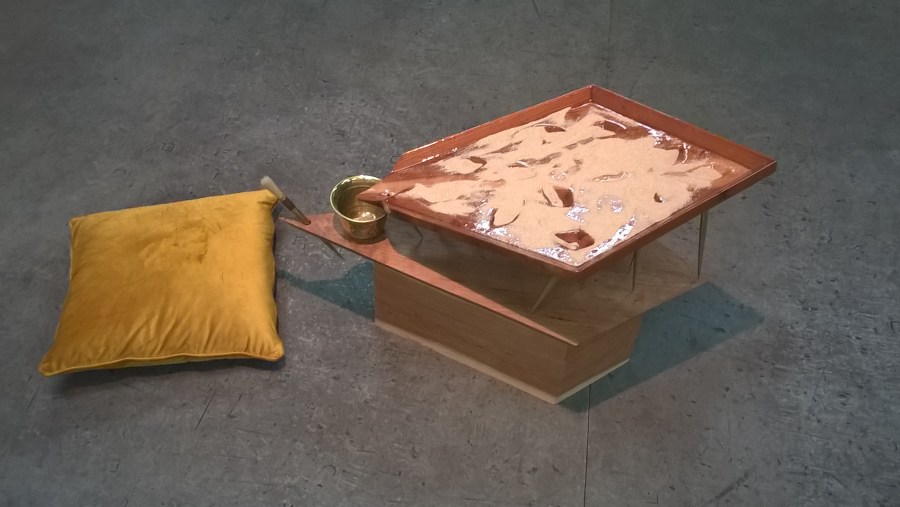 - Miné Kleynhans. Meditations On Resentment (2024). Cherrywood, brass, sand and found objects. 70cm x 43cm x 74cm
