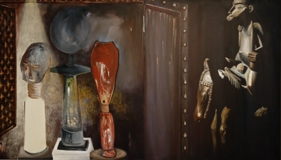 > Almost to a year since joinging Gallery Momo, Phoka Nyokong's hold no punches exhibition, Confrontation, is on till 15 December at that gallery. Working on a scale ranging from 91 x 92 cm to 380 x 247 cm this exhibition positions African fugurines / scukptures and masks to comment on unresoled issues of collonial legacy particularly on those at the recieving end. It is quite interesting how symbols such as the deker / sword and the gun are juxtaposed with teh butterfly and religion to create tension in the overall feel and look of this intellectually challenging exhibition. That sums up the tip of the icebeg of the content of some of the works on show. Technically speaking, Nyokong's painting is playful but nouances his maturity in painting in pieces such as the name sake of this show Confrontation (2024) and Discovery of Ancestral graffiti on a Night at the Museum of fools (2024) which you won't be blamed if you might read it as a link to Nyokong's ABSA L'Atelier solo exhibition title, Museum of New Hymns for the Confused, 2023. See image [2] below. During my viewing of confrontation I had a flashback of my interview with the artist in early spring of 2023. Aptly titled Hymnotic Pierce, in that interview Nyokong was very vocal about Africa's past and the injustices suffered at the hands of the West.