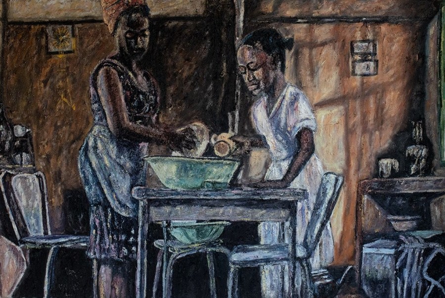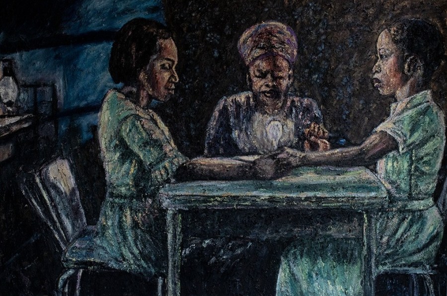 Except for the Passage to Promise (2024) and Kobo ya Sechaba (2024). This is the only work showing a multitude of people among the works selected for the exhibition. The other paintings which will be featured in the exhibition show either two or three people. For instance, in the closely related works, Future Forged (2024) and Lerato la Mme (2024), Selekane comments on house chores as a repertoire of responsibility that a mother can teach to her children and the power of prayer as an expression of love particularly where a parent prays with their children. In both works, there is an element of bonding. The viewer will also notice the different times that the two works have been set in. Light in these settings adds a dramatic effect to the visual narratives inherent in these two paintings.