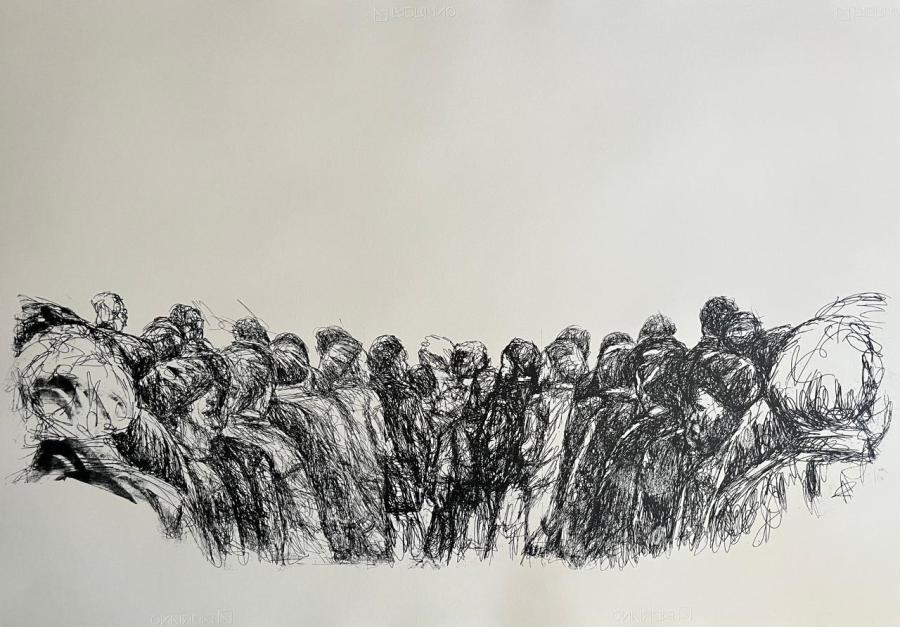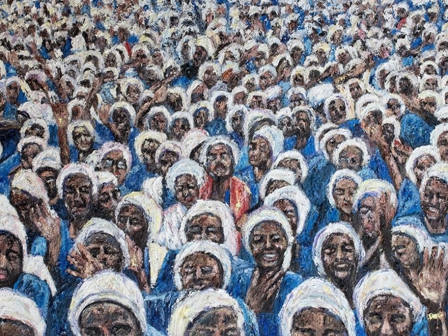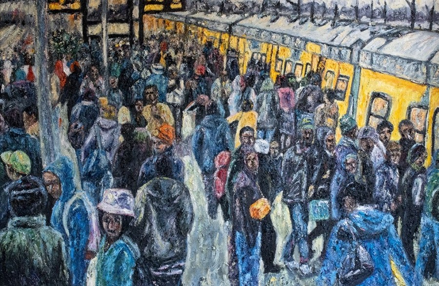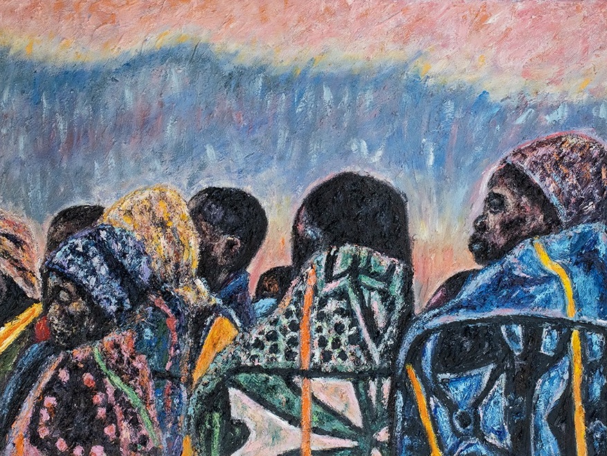 The diptych Rails of Migration (2024) connects earlier Selekane paintings to recent work through its overcrowding composition, strong palette, nuanced lines and thick impasto. In this painting, some of the figures in the crowds boarding or alighting from the trains on either side are aware that they are being watched. The artist points out that in our search for a better life, we are constantly moving from one place to the other. And for the daily commuters either to work or school, this movement is so engrained and naturalised that they seem oblivious to its constant undertaking.
