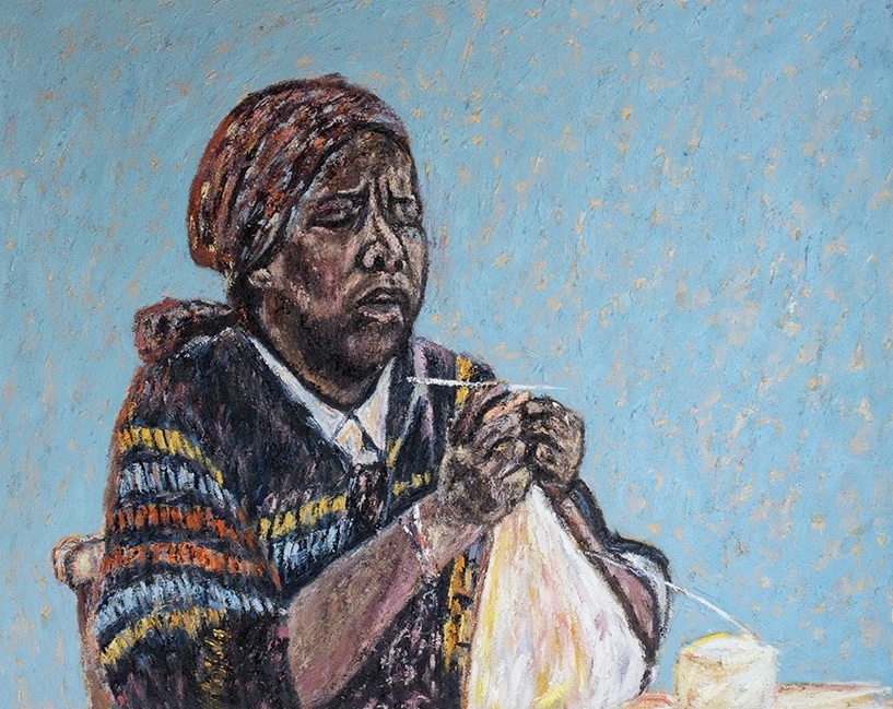 In the work Passage to Promise there is some remoteness in terms of what the artist might be commenting on. The faces of the women depicted are turned away from the viewer, denying a reading of their facial expressions. More of a morning scene than an afternoon draped with coldness. This work connects with Kobo ya Sechaba through its overall subject matter. Both works represent women and in both depictions, they are draped with blankets. But in the latter work, that is Kobo ya Sechaba, the women face the viewer, returning the gaze. The warm sky metaphorically connects with the warmth that the blanket alludes to. Furthermore, through its title, the work suggests the role that women play in nurturing Sechaba, our nation.