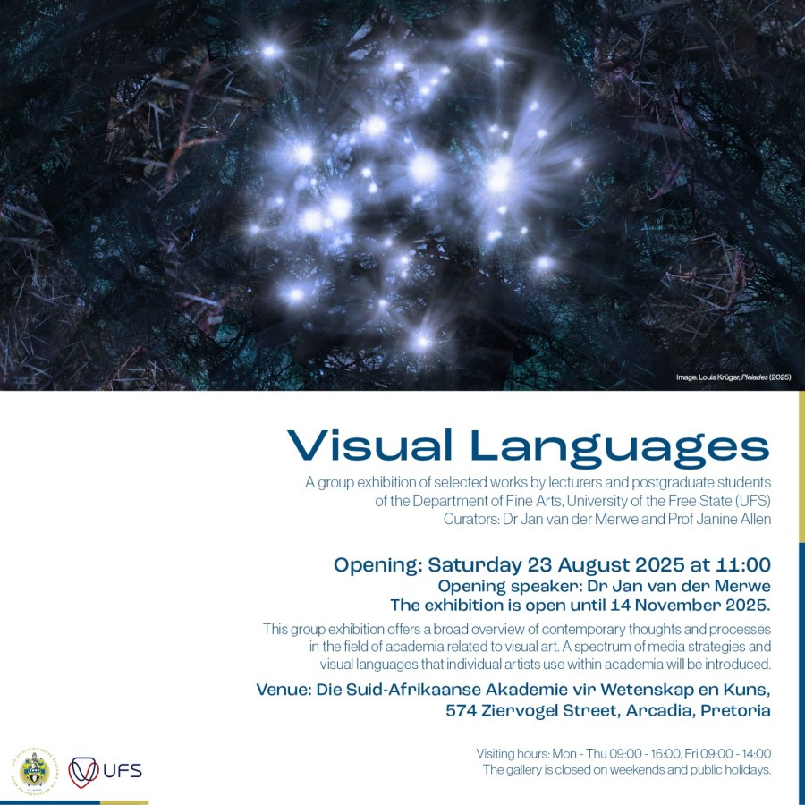 Yesterday I had the opportunity to have a preview of the exhibition Visual Languages, which opens tomorrow morning at 11:00 at Die Suid-Afrikaanse Akademie vir Wetenskap en Kuns (South African Academy for Science and Art). The academy is located at 570 Ziervogel Street, Arcadia, which is a walk away from the Union Buildings. The exhibition has been jointly curated by Janine Allen and Jan van der Merwe. It showcases works by postgraduate students and the staff of the Visual Arts Department at the University of the Free State. Digital art, mixed media, photography, lithography and pencil drawings carry various visual messages that comprise this exhibition. Unlike Jan van der Merwe’s previous curatorial effort at the same space, Retired Muses, for a group exhibition, this exhibition looks and feels looser in terms of the number of works featured. The works cover personal issues as well as sociocultural issues in their diverse enterprises. A common thread that runs through the body of work on show is the unique approach to artmaking that each artist has employed in bringing the artworks to life. Visual Languages will run until 14 November. You may listen to the podcast of my conversation with the curators [here].