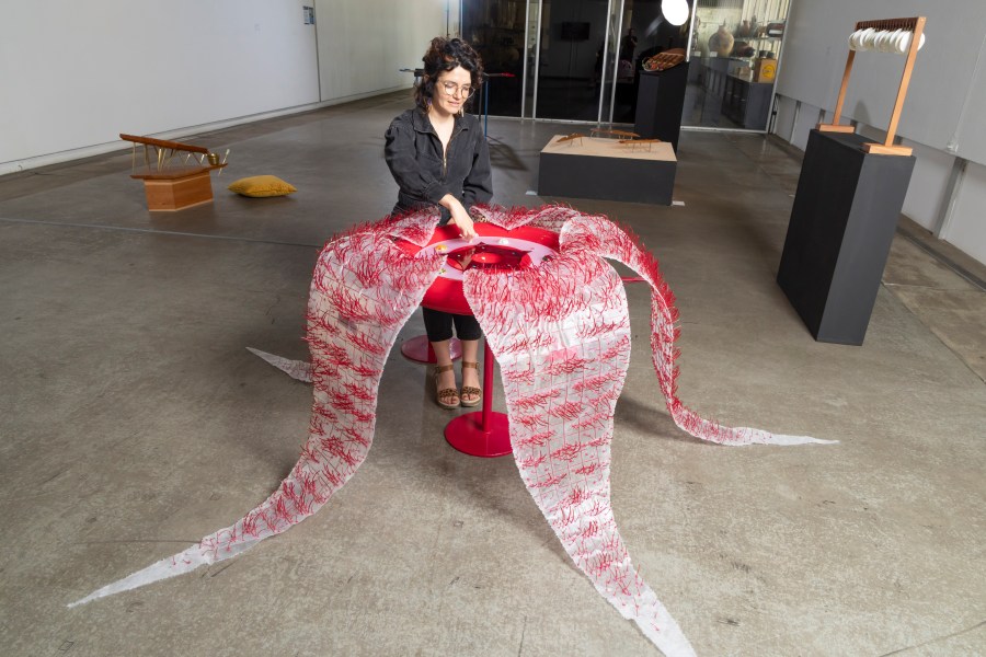 - Miné Kleynhans interacting with her installation, Orbea kako-occultus (2025)
